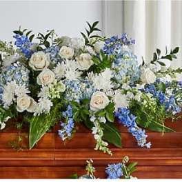 Price: $160.00 Heartfelt Tribute Blue & White Floor Basket Arrangement Product Tags: Same-day Delivery